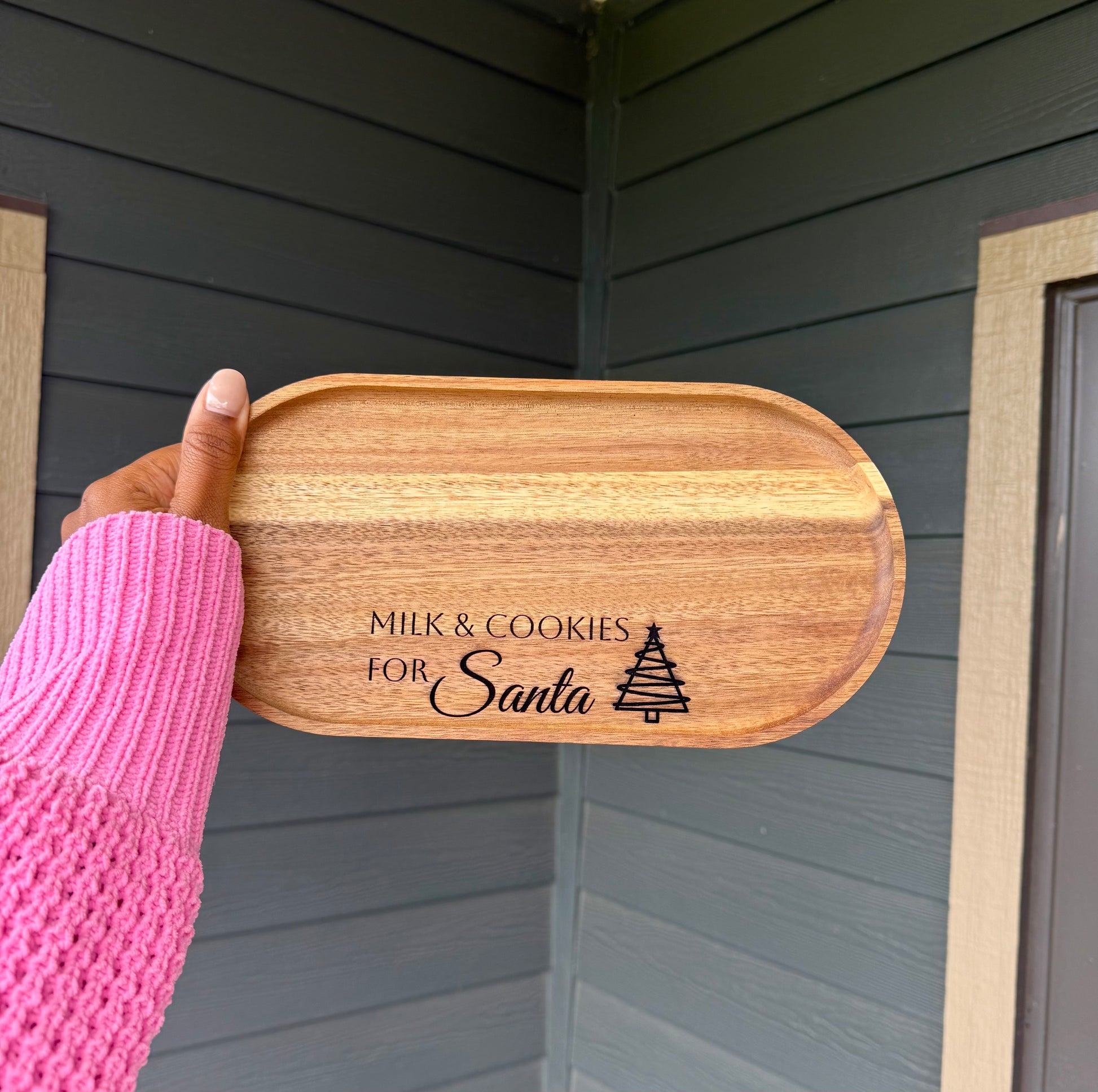 Milk & cookies tray for Santa! Available in 10” and 12” sizes. Engraving on one side only. Wood grain will vary.